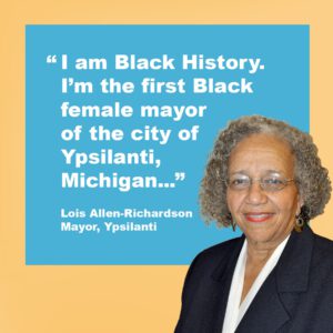 Lois Allen-Richardson, Mayor, Ypsilanti: I Am Black History. I’m the first black female mayor of the City of Ypsilanti, Michigan. I was promoted to mayor by resignation of the former mayor in 2020. I am President of the Michigan Black Caucus of Local Elected Officials.